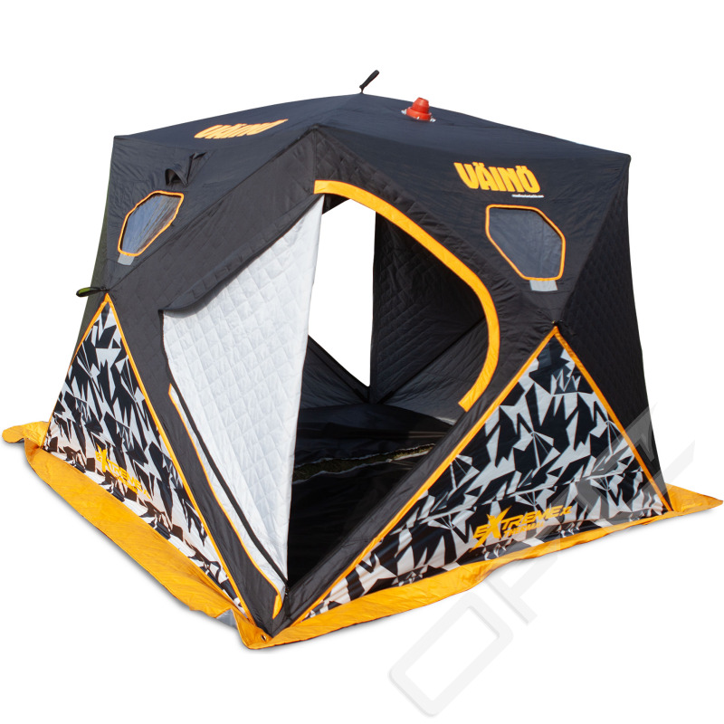 Väinö Bunker Thermal Extreme istält. De tre största modellerna, XL, XXL och XXXL, är tält av pop-up-typ, liksom övriga tält i Väinö Bunker-kollektionen, som är mycket snabba och enkla att sätta upp och ta ner. Tälten har PVC-fönster som kan täckas med en flik. SBS-dragkedjor garanterar dörrarnas funktion även i kallt väder. I tältet finns luftkonditioneringsventiler, som hjälper till att bli av med fukt. Ramstrukturen är 11,0 mm slitstark glasfiber. Materialet är ett speciellt Thermal Fabric-3 Layer, det vill säga trelagers 300D Oxford, vars huvudtyg är PVC-belagd tältduk, med ett isoleringsskikt emellan och ett fodertyg inuti. Tältet har en vattenpelare på 10 000mm. Öppna basen och fästena i hörnen för att förankra tältet i isskyddet. En förvarings-/bärväska ingår. XL- och XXL-modeller tillgängliga med en genomgång med en icke brännbar silikontät krage. Måttet på genomföringen är 5 cm i överkant men går att skära ner den och den är töjbar men 10 cm är max vad den går att töja i nedskuret läge.