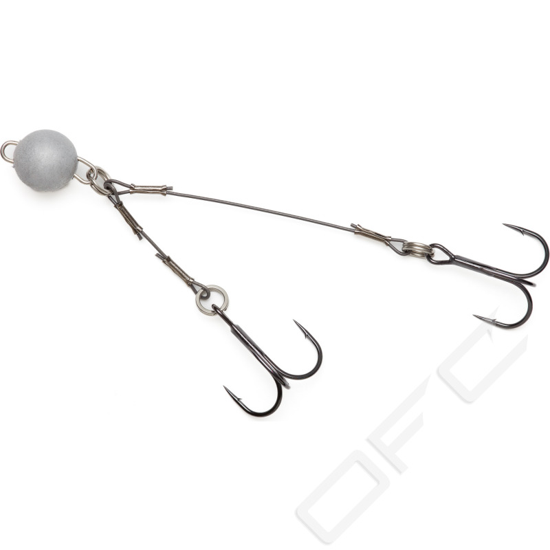 Gjord på en 60lb wire med en 10g zink jiggskalle och två trekokar från BKK i storlek #2. Levereras i en 2-pack.