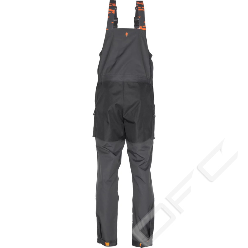 Byxorna är i en högre modell med reglerbara och ej avtagbara hängslen. Har tvåvägsdragkedja, handvärmarfickor, samt resår i linningen. Justerbara benslut med kardborre samt dragkedja.