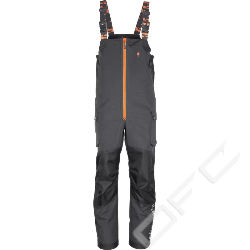Byxorna är i en högre modell med reglerbara och ej avtagbara hängslen. Har tvåvägsdragkedja, handvärmarfickor, samt resår i linningen. Justerbara benslut med kardborre samt dragkedja.