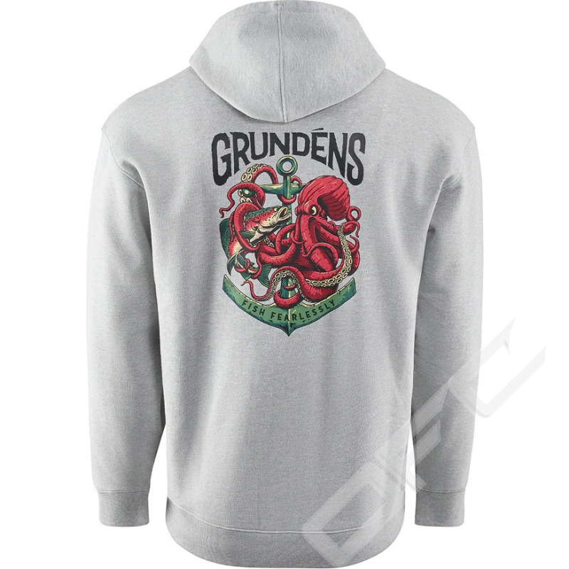En Grundéns originaldesign med "Zero Shucks" print på en heavy-duty hoodie. Denna heavy-duty hoodie är designad för att hålla hårt arbetande människor varma och skyddade från sjöstänk och lätt nederbörd. Den hållbara vattenavvisande ytan (DWR) på denna hoodie stöter bort fukt och fläckar för att hålla dig bekväm.