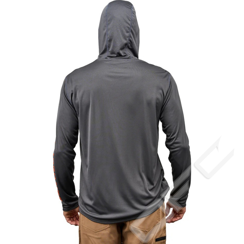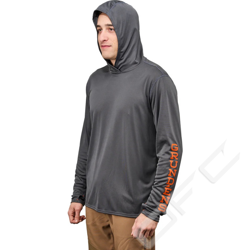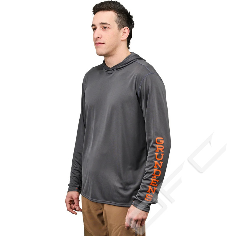 Den tuffaste soltröjan på vattnet, Grundéns Tough Sun Hoodie med UPF 50-märkning, erbjuder sportfiskare andningsbart solskydd med extrem slitstyrka mot slitage både på och utanför vattnet. Denna slitstarka UV-tröja är byggd för båtlivet eller trädgårdens påfrestningar och har en avslappnad cross-over huva som ger heltäckande skydd när den är uppfälld och maximal kylning när den är nerfälld. Integrerade tumhål håller ärmarna på plats för solskydd på handens baksida, och HeiQ-behandlingar mot lukt, värmereglering och fläckborttagning ökar Tough Suns lättskötta komfortegenskaper. Grundéns är så säkra på Tough Suns UPF-50 soltröjorna att de har livstidsgaranti. Om din tröja går sönder byter Grundéns ut den, utan några frågor.
