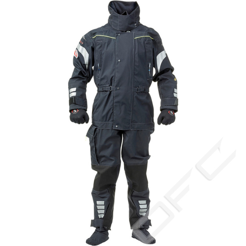 As its name indicates, the Ursuit Easy is extremely easy to dress and wear. The front zipper opens at the neck seal, assuring easy and fast donning. The dry zipper is covered by a protecting flap with push buttons. The high collar with fleece lining is detachable when not required, which in some circumstances may be a good option. Thanks to the integrated socks, you can choose the footwear which fits your needs in the best possible way. Ursuit Easy is not just a dry suit for water activities, but a suit for all kinds of use when you want to stay 100% waterproof. Thanks to the stylish design, this suit is more like normal clothing than a dry suit. The fit is also optimal for women thanks to the adjustable waist band. Water tight chest pockets are standard. The thigh pocket is equipped with fasteners for the attaching of a Squeeze Lock knife (the knife itself is optional). Material is vapor permeable and water tight 4-Tex fabric. Seam structure is patented seam construction, that is based on Flat Seam technology. Thanks to this technology, multiple layers can be avoided. Prominent reflective tapes assure the visibility. The wrist and neck seals are made of elastic neoprene, making dressing easier and adding to the thermal insulation at the wrists and neck. The detachable high collar with fleece lining protects from cold. A protecting hood is found inside the collar. Separate neoprene gloves and hood give additional thermal protection. Knee and back reinforcements.