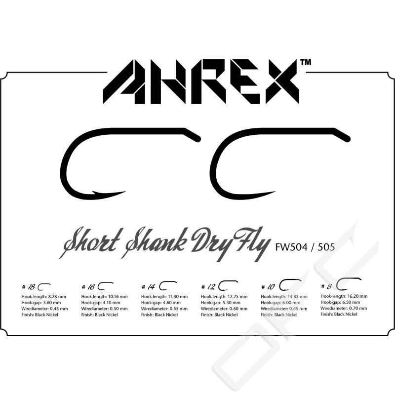 Ahrex FW505 är en hullinglös torrflugekrok med kortare skaft och bredare gap jämfört med FW500/501, kroken gör sig riktigt bra till mönster med lite mer volym.