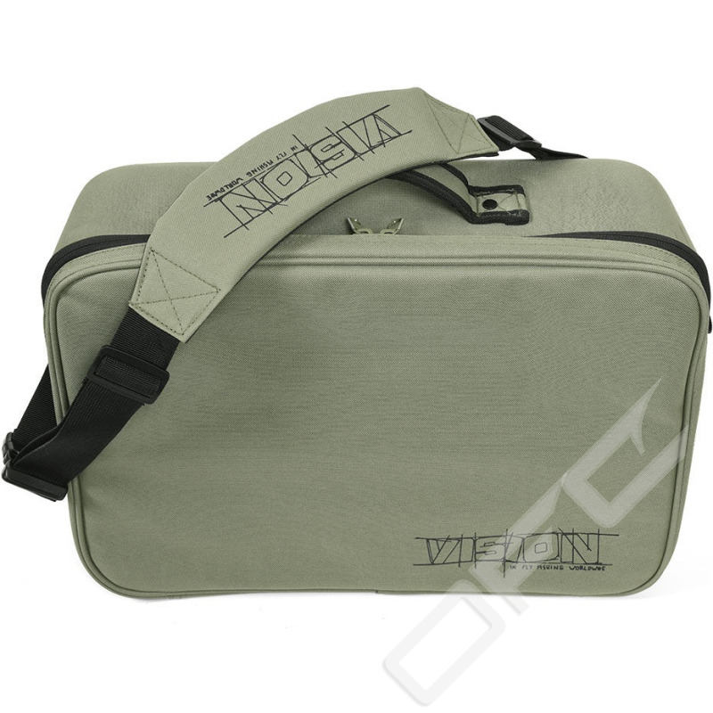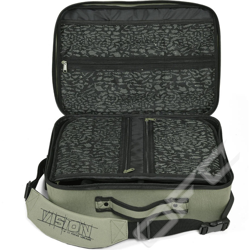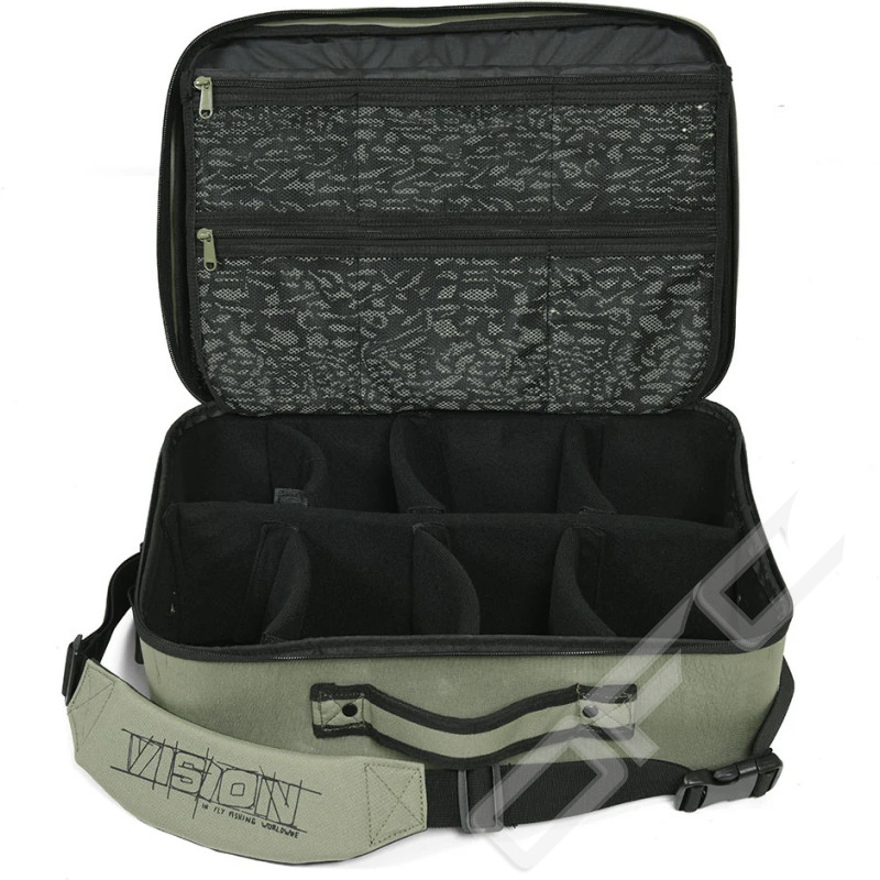 Vision Hard Gear Bag är en riktig mångsidig väska för den entusiastiska flugfiskaren. Den kan användas som en rymlig rullväska och rymmer ett stort antal flugrullar i olika storlekar, men tack vare sitt geniala innerväggssystem kan du modifiera den som du vill, efter dina behov. Förutom rullar kan du skapa ett utrymme för din digitala systemkamera eller videokamera. Eller så kan du använda den som en stor flugbindningsväska när du reser. Den mjuka avdelaren ger extra skydd när väskan är stängd och dess många blixtlåsfickor håller dina små tillbehör i ordning och lättåtkomliga. Den gjutna bottendelen är vattentät upp till nitarna och sömmarna.