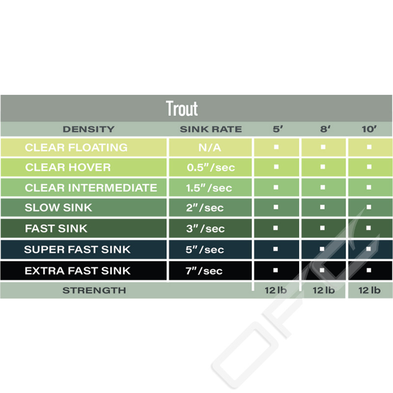 Utrustad med ett mångsidigt urval av polyleaders finns det bokstavligen ingen fiskestil eller taktik du inte är fullt utrustad för. Airflo Trout Polyleaders finns i sju olika densiteter som låter dig fiska i vilken del av vattenpelaren som helst, i alla typer av vatten. 8' Airflo Polyleaders hjälper till att vända torrflugor, nymfer och streamers. Konstruerade med en 12lb kärna som standard och finns i ett viktigt utbud av densiteter för att presentera dina flugor effektivt. Perfekt för användning av en fluga i älvar eller stilla vatten med tafslängder upp till 10 fot. Branschledande svetsade öglor gör dig inte besviken. Använd med tafsar/tippet upp till 5,4kg (12lb) brottstyrka.