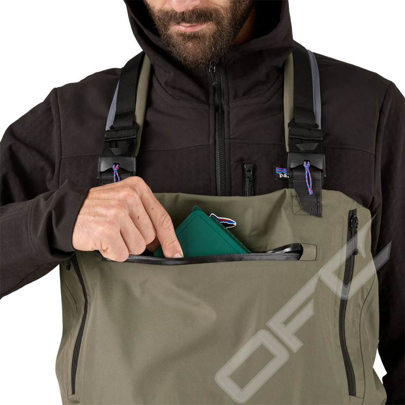 M's Swiftcurrent Expedition Waders har flera smarta detaljer på insidan som en drop-in ficka, en borttagbar och vattentät ficka byggd med TRU® Zip-teknologi, en stretchficka med dragkedja och en loop för att enkelt kunna hänga upp vadarna på torkning samt för enklare förvaring. På utsidan hittar du en stor bröstficka för förvaring av flugask och även annat du kan tänkas ha med dig, ett Secure Stretch vadarbälte, fästpunkter för verktyg, D-loopar för fastsättning av olika tillbehör och även en loop för fastsättning av håv i ryggen.