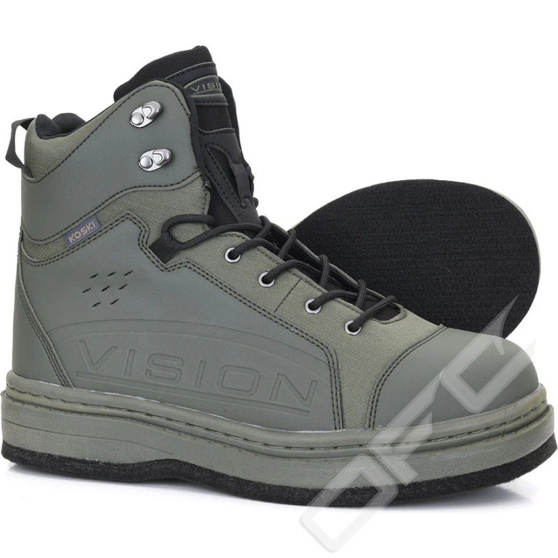 Den stark och lätta Vision Koski vadarskon är gjord av slitstarkt ripstop-nylon och PVC-material. Denna materialkombination absorberar inte för mycket vatten, så den torkar snabbare och förblir lätt även när den är blöt. PVCs egenskaper gör denna sko mycket stödjande och ger skon en bra stabilitet och vridstyvhet. Ovandelen av skon är sydd till den gjutna EVA-mellansulan för styrka. Den nydesignade främre delen gör att skon kan böjas mer naturligt när man går.