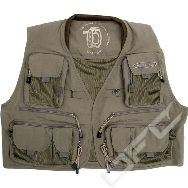 Vision Caribou västen är utrustad med många fickor, kraftiga blixtlås och kardborre. Västen i sig är tillverkad i högklassig och hållbar nylonväv som är vattenavstötande och axelpartiet är försett med ett extra skikt poröst material som fördelar vikten på att bra sätt så att du inte ska känna att det är jobbigt att ha västen på dig.