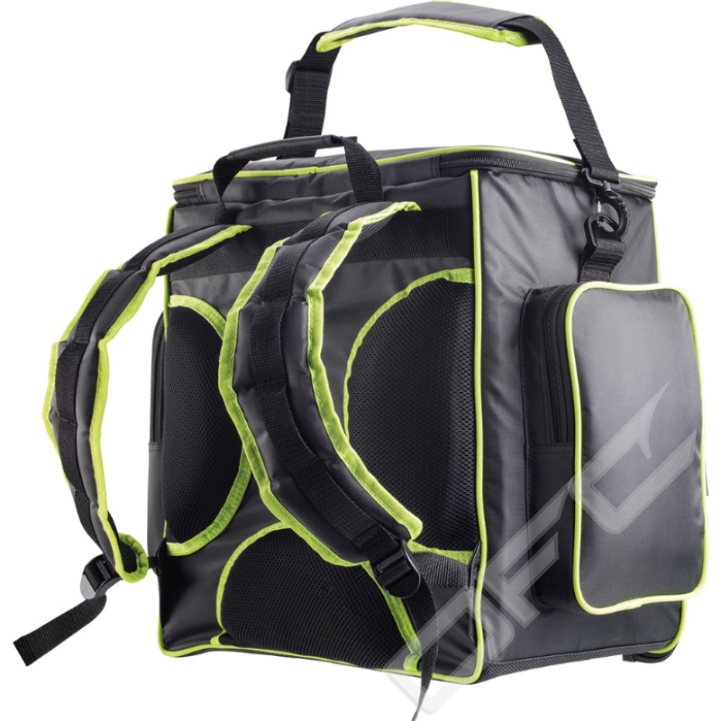 I det stora övre facket kan mycket tillbehör och utrustning som tänger, rullar mm förvaras. Det hårda fodralet på framsidan är gjort för att förvara ett par glasögon. Ryggen är tjockt vadderad för att du ska kunna bära ryggsäcken bekvämt över längre sträckor även när den är fullpackad. Med gummerad botten och halkskydd för att förhindra halkning på hala ytor och inträngning av vatten.