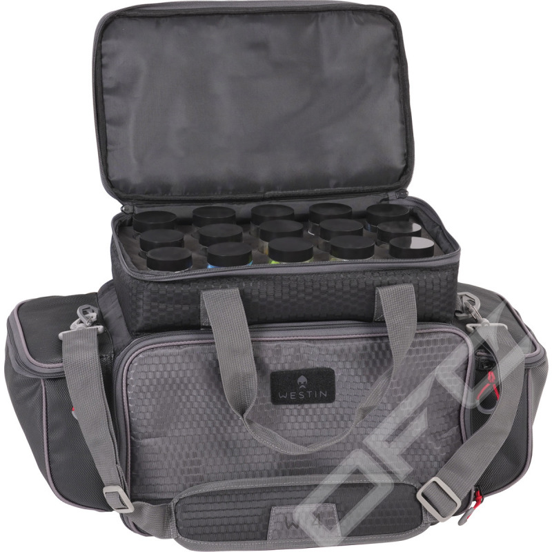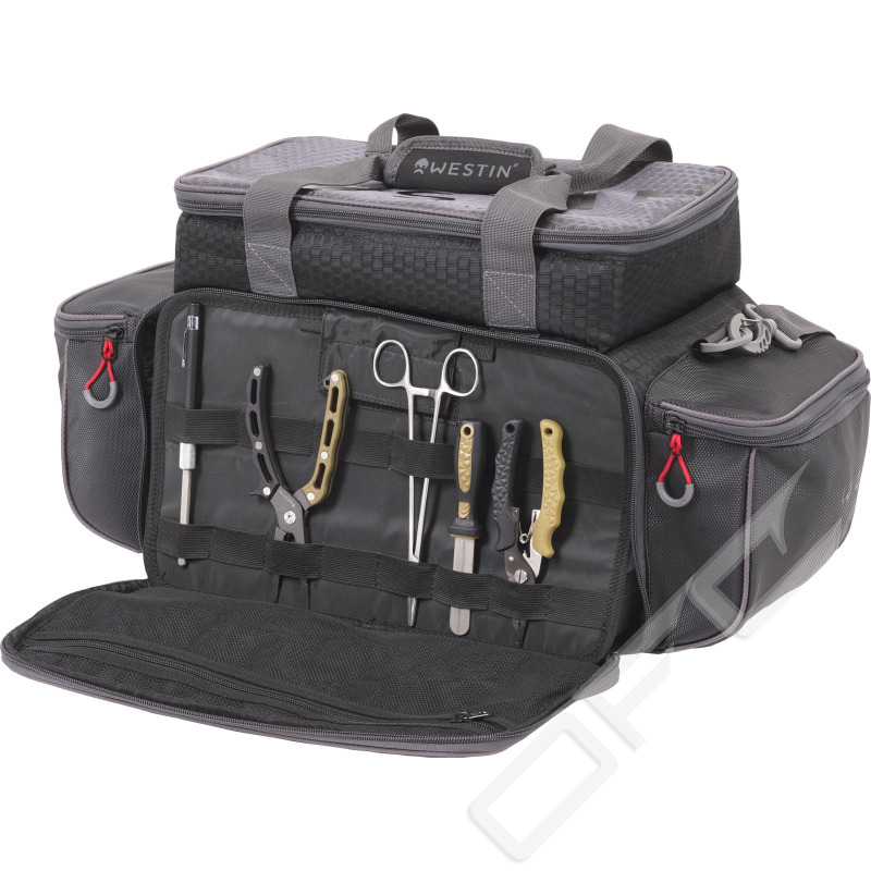 W4 P&T Master Bag är den perfekta lösningen för att hålla ordning på all din utrustning. Huvudfacket innehåller fem Westin Tackle Boxes, med det övre facket för förvaring av burkar med regnbågsbeten i en EVA-hållare. Ha verktyg nära till hands i den främre verktygsorganisatören. Sidofickorna håller dina tillbehör nära till hands när du behöver dem. Med vattentåliga material, bärhandtag och en avtagbar vadderad axelrem, håller W4 P&T Master Bag all din utrustning skyddad.