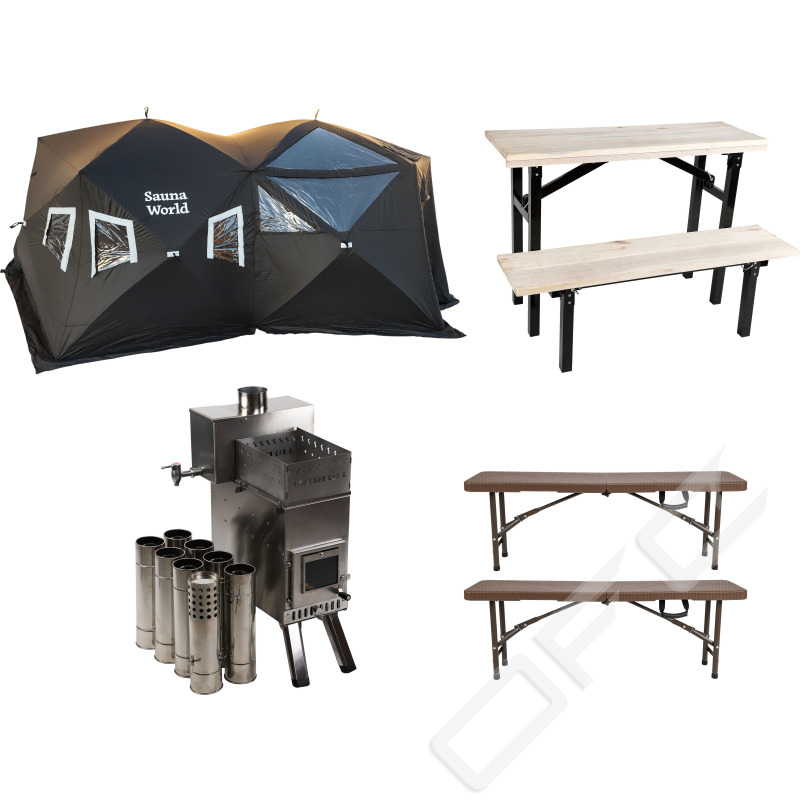 Sauna World från iFish är ett bastutält som passar utmärkt för familjen eller kompisgänget som vill bada bastu i naturen. Här i ett komplett paket med bastutält, 2st 1-våningsbänk, 1st 2-våningsbänk, 1st kamin med tillhörande rör; vattentank och stenkorg.