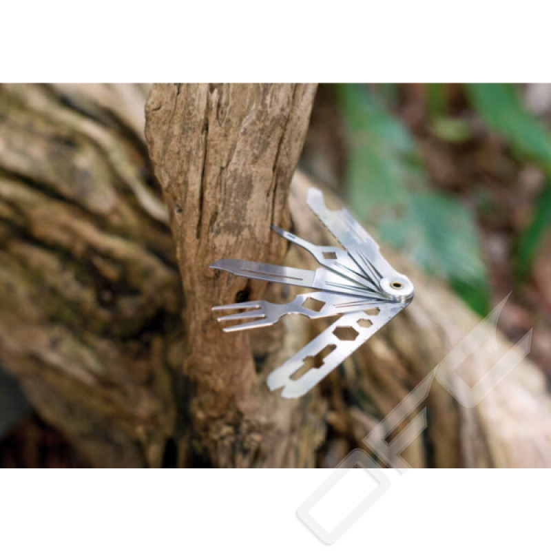 Funktioner: Flasköppnare, fiskskalare, trådstrippa, cm-skala, hexmutter (4 x), vingmutteröppnare, ostknivblad, bradawl och sömnad, kvadratisk (2 x), gaffel, skruvmejsel