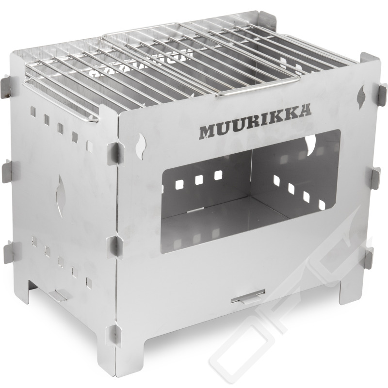 Vildmarkskök av rostfritt stål. Lätt att bära med sig och enkelt att montera. Tillaga din favoritmat på grillgallret när du är ute på picknick eller vandring. Välj en plats för vildmarksköket där elden inte riskerar att sprida sig eller skada mark och vegetation.