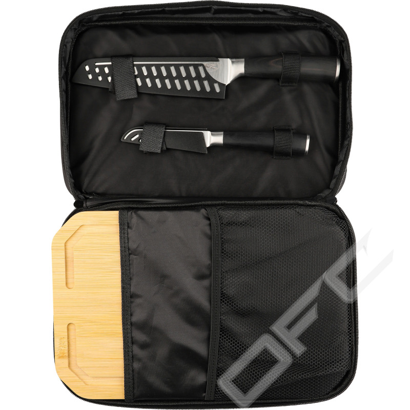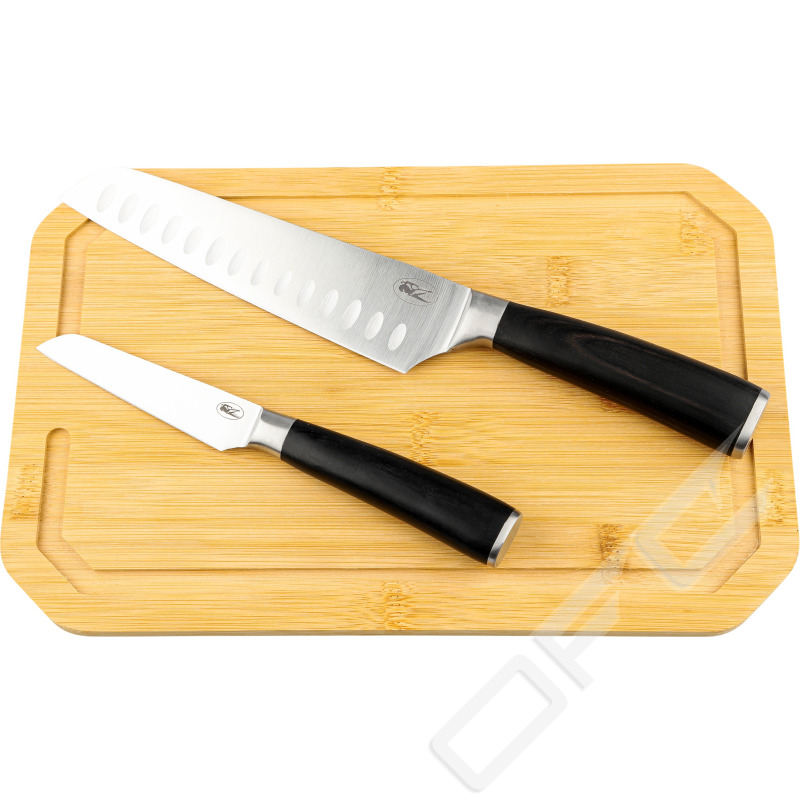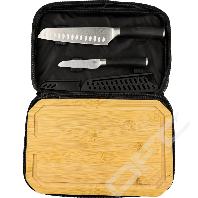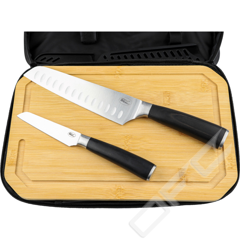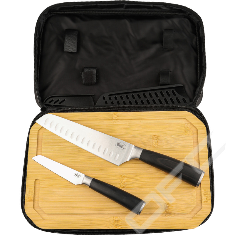 Fine Dining är ett knivset bestående av kockkniv, skalkniv, skärbräda och förvaringsväska. Knivarna har praktiskt utformade blad i rostfritt stål och trähandtag.