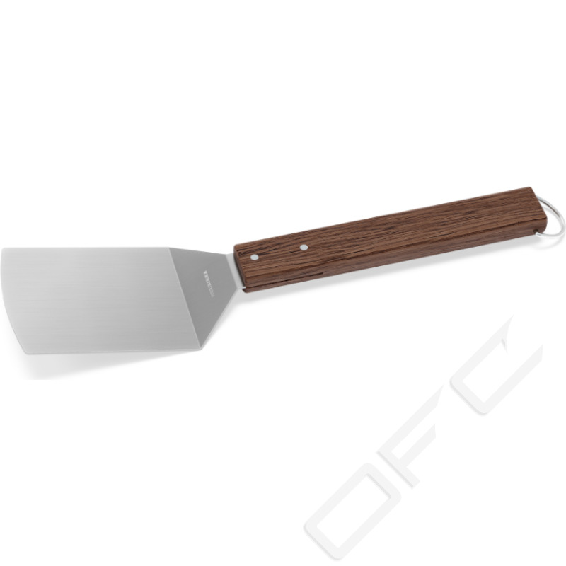 Grill- och stekspade av rostfritt stål med ett D-format ergonomiskt handtag av FSC-cerifierat rökt ask. Ett tåligt, hårt och vackert träslag som är värmebehandlat för lång livslängd. Extra tjockt material, perfekt för att trycka ut exempelvis hamburgare. Längd 34 cm.