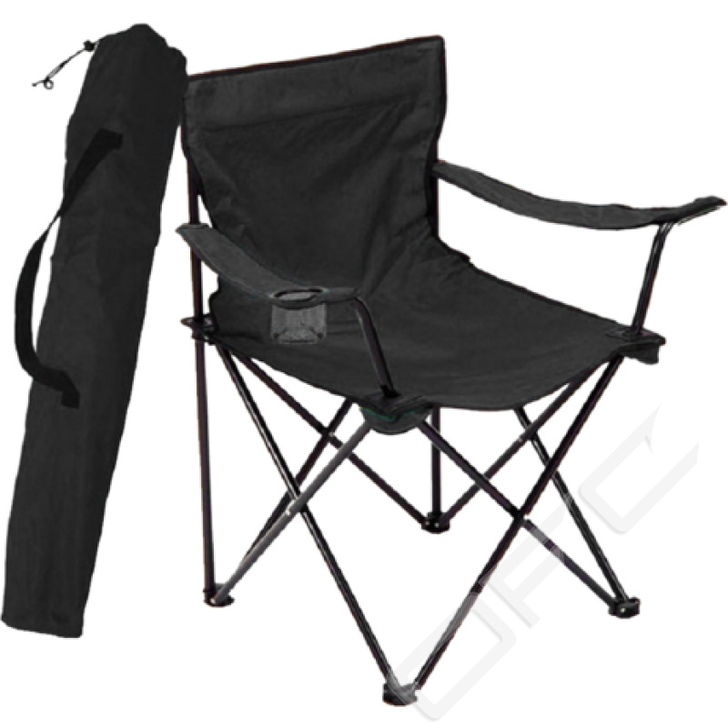 Prisvärd hopfällbar stol med metallstomme och polyestertyg.
