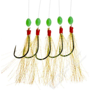 Fjäderhäckla Glittergul är en häckla från Fladen för fiske efter torsk och makrill. Just denna häckla är även utrustad med självlysande kulor. 5st krokar i storlek 4.