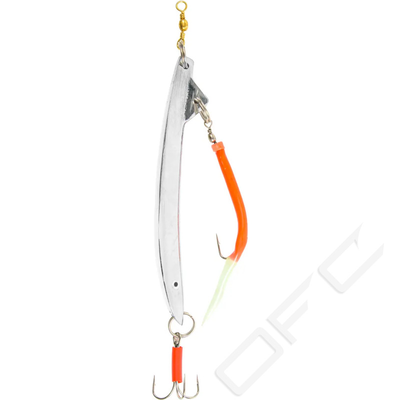 Banan Pilk Med Gummi Makk – detta klassiska havsfiskedrag är framtaget för fisket efter torsk, sej och andra arter som finns på djupet. Den böjda "banan"-formen wobblar lockande vid nedsläpp och invevning, samtidigt som den slitstarka Gummi Makk-kroken ger extra rörelse och attraktion. Perfekt för fiske i starka strömmar och djupa vatten där tyngd och rörelse är avgörande mellan succé och fiasko.
