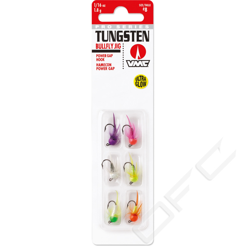 Den nya VMC Tungsten Bullfly Jig har en större och bulkigare kropp tillverkad av gåsfjädrar. Skallen av Volfram gör att den sjunker snabbt vilket är en stor fördel när fisken är i stöten och äter. Fjädrarna ger betet liv och lockar till hugg vid minimala rörelser vilket imiterar vattenlevande insekter som älskas av öring, röding och abborre bland andra. Kan fiskas som mormyshka eller under exempelvis ett rödingblänke. VMC Power Gap-kroken har ett 5 % större gap än traditionella jiggkrokar och ger därför ökad krokningsförmåga. Tungsten Bullfly Jig är perfekt balanserat och det förstärks av ett 90 graders krokögla som säkerställer en optimal horisontell presentation och perfekt vinkel för att kunna kroka fisk!