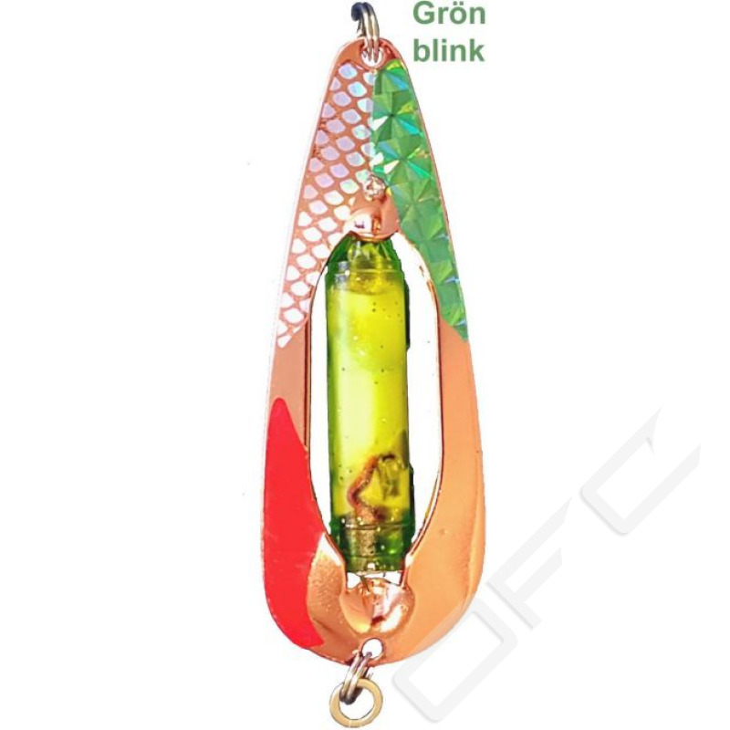 Orginalblänket för blinkar. Det är lätt att byta till andra typer av blinkar, såväl med inbyggda som utbytbara batterier. De flesta passar att montera i Blinkpirken Original. Här är dubbelblinken monterad. Levereras komplett med dubbelblink, tafs och krok.