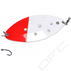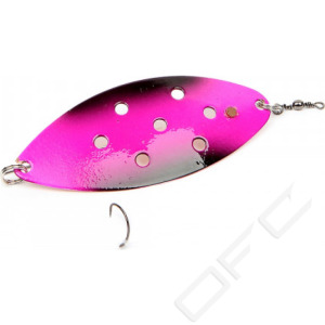 Ett riktigt grymt rödingblänke från Väinö. Möjlighet finns att sätta fast en blink på baksidan av detta blänke, dunder combo tillsammans med den perforerade plåten blänket är gjort av! Målade i starkt fluorescerande UV färger vilket röding och annan fisk tycker om! Levereras komplett med tafs och krok.