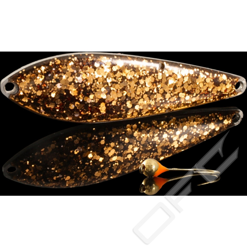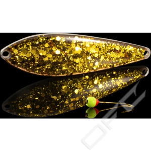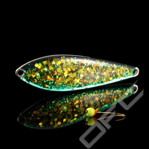 Den glittriga ytan imiterar fiskens fjäll och det genomskinliga ytskiktet framhäver pirkens färg då ljuset från ytan silar ner genom den.