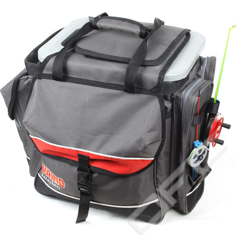 Ryggsäcken är gjord av 600D Polyester. Inuti ryggsäcken finner du "hinken" gjord i plast och med lock på som man kan sitta på. Det är bekvämt och smidigt att släppa ned den fångade fisken genom öppningen ovanpå den.