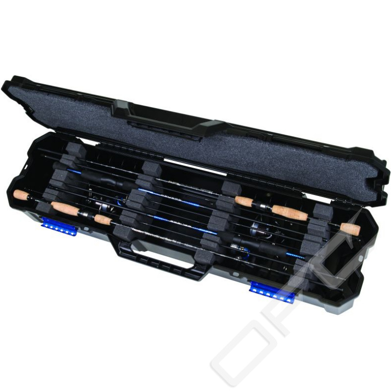 Utformad för att hålla (2) 6,5 fot långa spön längs sidorna och (2) 6 fot långa eller mindre spön i mitten