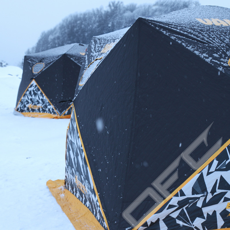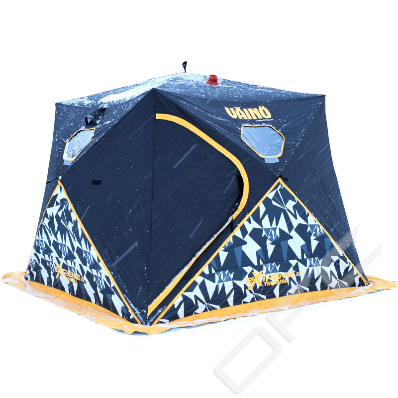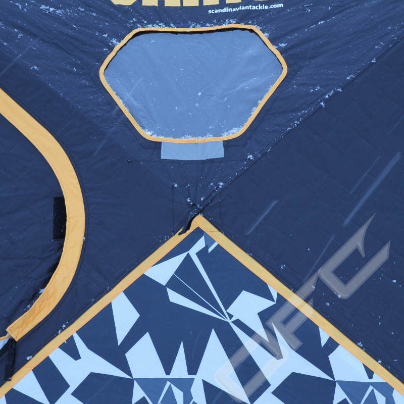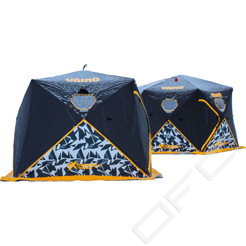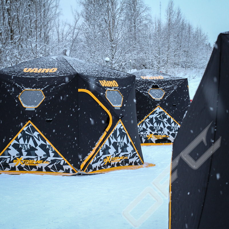 Väinö Bunker Thermal Extreme istält. De tre största modellerna, XL, XXL och XXXL, är tält av pop-up-typ, liksom övriga tält i Väinö Bunker-kollektionen, som är mycket snabba och enkla att sätta upp och ta ner. Tälten har PVC-fönster som kan täckas med en flik. SBS-dragkedjor garanterar dörrarnas funktion även i kallt väder. I tältet finns luftkonditioneringsventiler, som hjälper till att bli av med fukt. Ramstrukturen är 11,0 mm slitstark glasfiber. Materialet är ett speciellt Thermal Fabric-3 Layer, det vill säga trelagers 300D Oxford, vars huvudtyg är PVC-belagd tältduk, med ett isoleringsskikt emellan och ett fodertyg inuti. Tältet har en vattenpelare på 10 000mm. Öppna basen och fästena i hörnen för att förankra tältet i isskyddet. En förvarings-/bärväska ingår. XL- och XXL-modeller tillgängliga med en genomgång med en icke brännbar silikontät krage. Måttet på genomföringen är 5 cm i överkant men går att skära ner den och den är töjbar men 10 cm är max vad den går att töja i nedskuret läge.