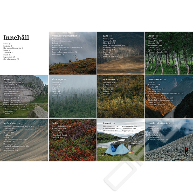 I den här boken får du 95 vegetariska recept från olika delar av världen som du kan tillaga när du är ute. Alla recept i boken är anpassade för att kunna tillagas under turer som varar längre än ett par dagar, till exempel en fjällvandring. Ingredienserna klarar av att förvaras i rumstemperatur, de är lätta att bära med sig, tar inte så stor plats i packningen och koktiden är så kort som möjligt.