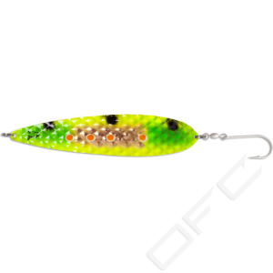 A new spoon for big salmon. With its size and somewhat higher weight (than standard trolling spoons), the Salty Diamond spins tantalisingly whenever the boat slows down a little, e.g. via the effect of waves or on the inside when the boat is taking a curved trajectory. This special series has been specifically developed for monster migrating salmonids in collaboration between Peter Cernold (Team 4Reels Sweden) and Mike Luner (Team Beluga Germany). When it came to choosing the colouring, the two specialists took inspiration from the most successful patterns in Scandinavia and Germany (Rügen). Mounted with a large single hook to guarantee an optimal hold, as used by many professionals when targeting salmon.