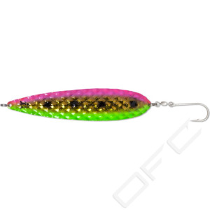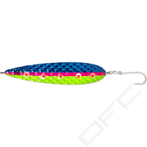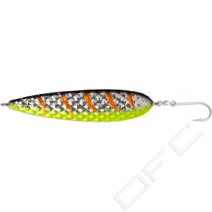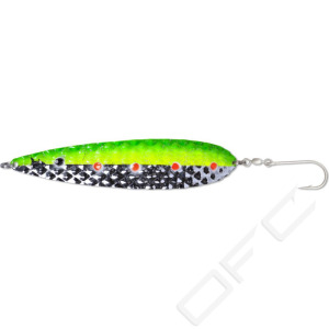 A new spoon for big salmon. With its size and somewhat higher weight (than standard trolling spoons), the Salty Diamond spins tantalisingly whenever the boat slows down a little, e.g. via the effect of waves or on the inside when the boat is taking a curved trajectory. This special series has been specifically developed for monster migrating salmonids in collaboration between Peter Cernold (Team 4Reels Sweden) and Mike Luner (Team Beluga Germany). When it came to choosing the colouring, the two specialists took inspiration from the most successful patterns in Scandinavia and Germany (Rügen). Mounted with a large single hook to guarantee an optimal hold, as used by many professionals when targeting salmon.