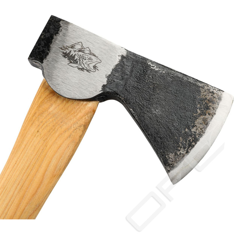 Praktiska yxa med motiv från IFISH med skaft av hickory. Yxorna är smidda av 45# kolstål som härdats till 48-53HRC. Skaften är tillverkade av amerikansk hickory som oljebehandlats. Levereras med exklusivt eggskydd av naturläder
