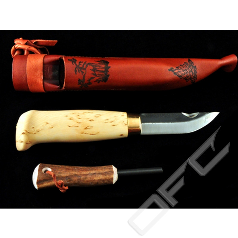 Finsktillverkad samekniv med eldstål. Bladlängd 75 mm. Knivbladet har ett urtag på ryggsidan där man drar eldstålet. Kolstålsblad HRC 59. Kniven har skaft av masur och eldstålet har skaft av renhorn. Läderfodral med älgmotiv.